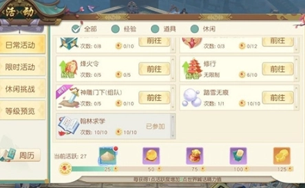 在《神雕侠侣2》里,玩家能借助任务、战斗和活动获取经验值。日常活动中有个专门刷经验的项目,它的图标是宝塔形状,旁边配有向上的箭头,名字叫“修行”,上限次数为10次,设计得十分直观。参与“修行”时,玩家可依据自身等级,在古墓三层里任选一层,再使用多倍经验丹,开启自动巡逻和战斗功能,无需手动操作,经验就会源源不断地增加。接下来,就为大家详细介绍《神雕侠侣2》中的修行活动,也就是古墓修行的玩法。
