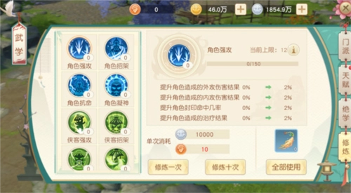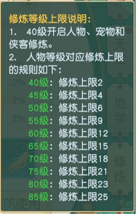 修炼能够提升角色、侠客和宠物的百分比属性;修炼的上限和人物等级相关。每次进行修炼都会消耗银币、帮贡、秘参、鹿茸、灵芝等物品。