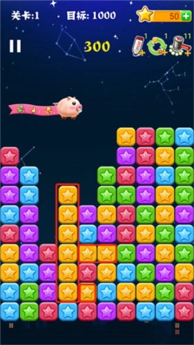 2、如图所示,只要是颜色相同的星星连在一起,我们就可以点击消除。