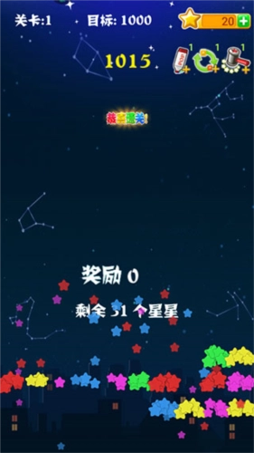 5、在一局游戏里尽量实现多个星块的多次消除,积少成多的得分其实和一次消除大量星块的得分相差不大,只要最后剩余的星星数量不多,就能获得2000分的奖励。