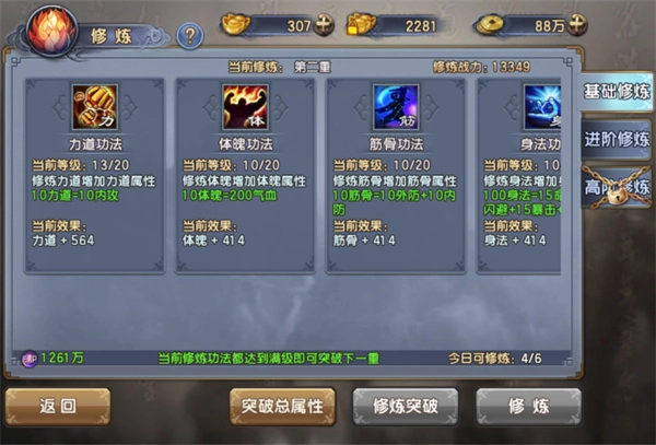 修炼分为基础、进阶、高阶三类,每类修炼都包含若干小功法。当小功法修炼至顶级后,可通过突破获取更高的属性增益,同时解锁小功法的更高等级。此外,三类修炼也能通过突破逐步开启。