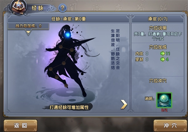 经脉从任脉起始,延伸出多条不同的脉路(其他脉路侠客们可点击右下角的“>”图标翻页查看)。每条脉路里都分布着若干穴位,每成功打通一个穴位,就能获得相应的穴位属性加成。打通穴位需消耗一定数量的“子风露”,穴位的重数越高,所需消耗的子风露就越多,对应的属性加成也会更丰厚!子风露可通过商城购买、挑战炼丹炉副本等方式获取哦!