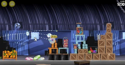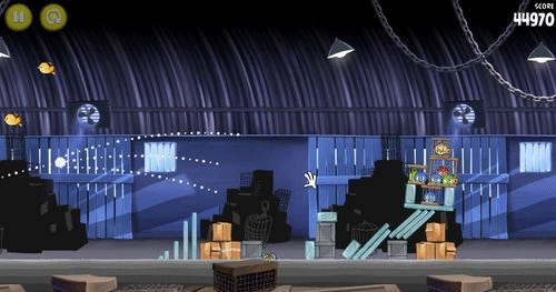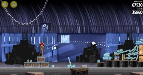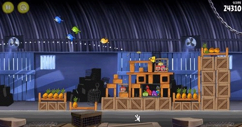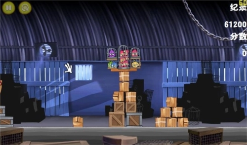 这一关操作起来有点棘手,对瞄准目标的精度要求很高。你得操控黄色小鸟,精准对准建筑物中间那部分的方块空心木架,并且射击时一定要先把第一个笼子摧毁掉。只要用一只小鸟完成任务,就能拿到三星评价。