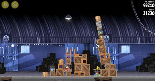 这一关的玩法和前面类似。先让小鸟散射攻击,把前面的两座建筑物摧毁;接着利用剩下的物件去推倒最右边的建筑物。