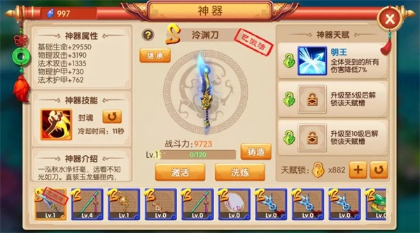 神器的天赋能为上阵英雄带来各类属性加成。不过神器的天赋是随机生成的,如果想更换神器附带的天赋,可以通过洗练来进行替换,直到获得自己满意的天赋。当然也要留意“仙玉”的消耗情况,毕竟洗练神器更换天赋,是需要消耗“仙玉”的。