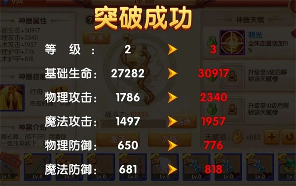 每个神器所加成的属性各有不同,像生命、护甲、法攻、物攻这类都包含在内。而且神器每提升一级,获得的属性增益就会更显著!那么究竟要怎样进行培养升级呢?请听小编慢慢为你讲解~
