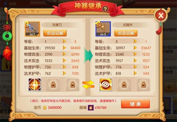 神器页面设有继承功能,该功能旨在为各位仙侣提供便利,助力大家更轻松地培养心仪的神器。通过消耗器魂与金币,可实现神器等级、天赋与其他神器的互换,且神器品质越高(S/A/B/C),所需消耗的器魂和金币就越多。
