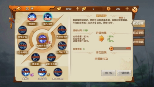 2、武学技能会随等级逐步解锁,61级时将习得最后一个技能。初始阶段即可更换招式,但可选范围有限,此时可前往武学套路界面查看。