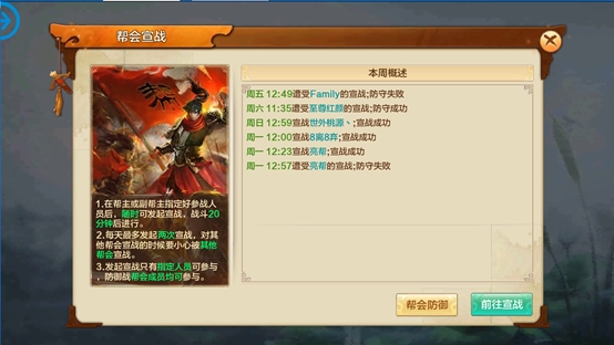 2、每天发起宣战的次数最多为两次,向其他帮会宣战时需留意可能被对方宣战的情况。