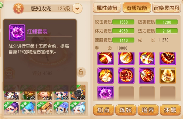 更不用说,在近期的战斗平衡调整里,红鲤的套装效果也得到了加强,其物理伤害结果提升的回合数有了明显改变。再加上强力的降防内丹“秋枫破”以及“高级突进”技能,红鲤在全民攻宠中无疑是顶尖的暴力存在。