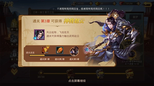 3、玩家通过前三个章节的关卡后,就能获取神将赵云,拥有赵云后,过图基本就会很轻松啦!