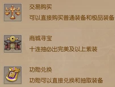 首先,玩家可以通过交易行购买其他玩家上架的非绑定装备。其次,商城寻宝是获取高品质装备的最快途径,建议使用绑金进行十连抽,这样必定能获得完美品质及以上的紫色装备,还有较大几率得到无双品质装备。另外,还可以用功勋兑换装备,每日功勋上限为一万点,玩家可在商城用功勋兑换紫色装备,但每个等级的装备仅能兑换一次,多余的功勋则可用于功勋十连抽,必定产出绿装,而相同颜色的装备可以合成更高品质的装备。