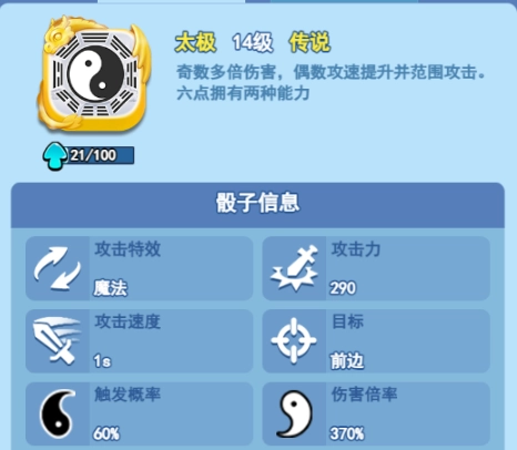 太极的玩法更具趣味性,奇数点数时对单个目标造成多倍伤害,偶数点数时提升攻击速度并触发范围攻击;当点数提升至6点时,两种能力会结合,既能造成多倍伤害,又具备范围伤害效果。它的攻击类型为魔法攻击,初始攻击力150,攻击速度1秒/次,触发概率60%,伤害倍率310%——这使得太极在清线和应对boss时都有出色表现:打boss可用奇数点数,清小怪可用偶数点数,合成六星后则能直接造成AOE范围伤害。