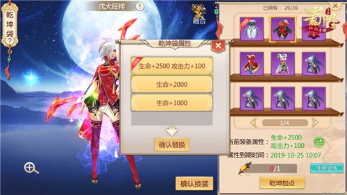 每套永久时装都将被赋予乾坤袋属性加成,只需将时装穿上并放入乾坤袋,就能激活属性;所有属性归属于乾坤袋,同一时间仅可装备一个属性,且可随时更换。乾坤袋属性为限时属性,其生效时间是所有放入乾坤袋的时装所提供的生效时间总和,所有属性的有效期均为15天,属性过期后,可使用【金线】道具为属性延期。
