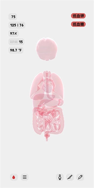8、屏幕右上角显示的是该人体模型的异常状态,比如此刻,她正处于低血钾和低血糖的状态中。