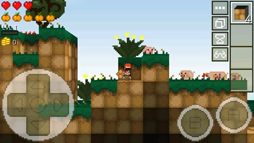 屏幕左下角设有用于控制移动的虚拟摇杆,玩家可借此操控角色移动并向前探索;右下角的A键为跳跃功能,连续按下两次即可实现两段跳,B键则是攻击键。在冒险过程中,玩家需要通过跳跃、潜水和挖掘等方式来保护自身安全。