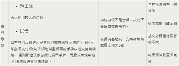 3、森林联盟的开展方式有两种:一是投放民意指示物,即通过弃置支持者牌堆中的多张牌来扩大民意影响;二是借助已招募的士兵,让其移动至无人占领的领地,随后将这些士兵转化为民意。