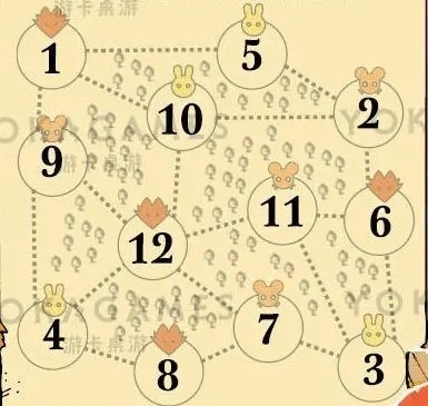 右上角②号位置是猫咪常见的开局选择,两个空槽对贵族有较大吸引力,但外围的⑤⑩⑥号位置互不相连,导致该位置四面受敌,处境十分险恶。
