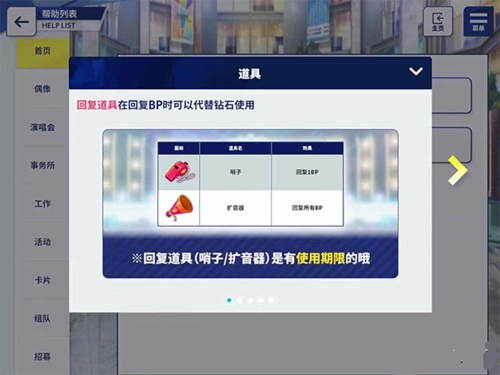 另外还有小喇叭和哨子这两个道具,小喇叭每次能回复10个BP,哨子每次可回复1个BP,这两个道具都挺实用的。其中哨子可以通过在充值页面购买应援月卡,每天领取5个。