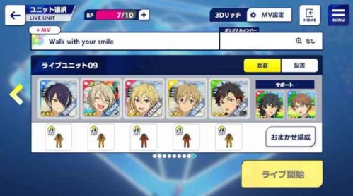 选歌界面提供了多种声线选项,我挑选了那些听起来与选歌界面风格相近的偶像组成队伍,队伍成员的位置无法调整,实际效果和选歌界面会存在细微差异。