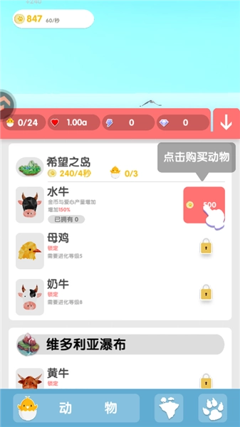 3、当积累了足够的金币后,我们就能购买动物,这样不仅能提升岛屿的金币与爱心产出,还能让岛屿变得更有生机。