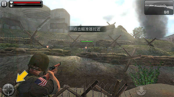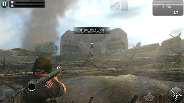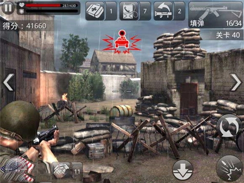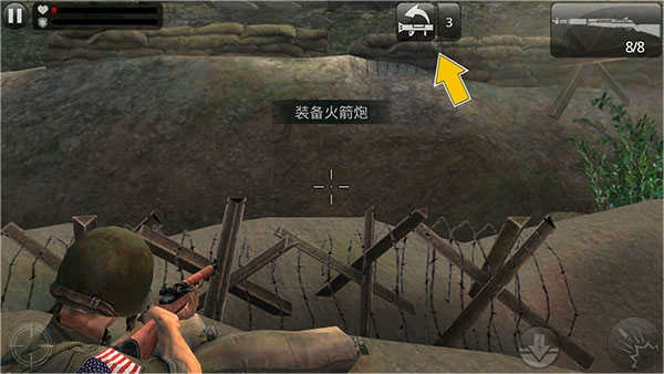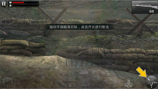然后,右边还有一个向下的箭头按钮,用于蹲下躲避;右下角的按钮则是开枪键。另外在《火线指令》里,玩家配备了狙击枪和机枪两把武器,右中部有个按钮可以灵活切换枪支。游戏中的子弹会自动上膛,不过玩家也能通过点击屏幕手动上弹。