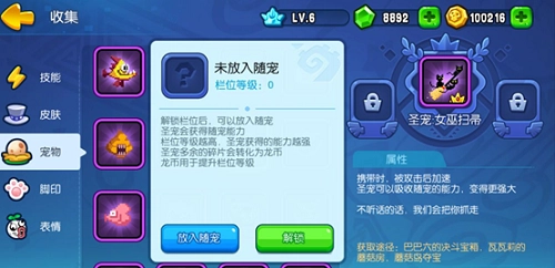 野蛮人大作战的宠物系统新增了圣宠和随宠系统。进入宠物界面后,带有【皇冠】标识的宠物就是圣宠,点击圣宠可进入其专属界面,当前版本共有五只圣宠,后续将陆续开放更多。点击随宠框会弹出随宠栏位界面,初始状态下随宠栏处于锁定状态,需要先进行解锁操作。
