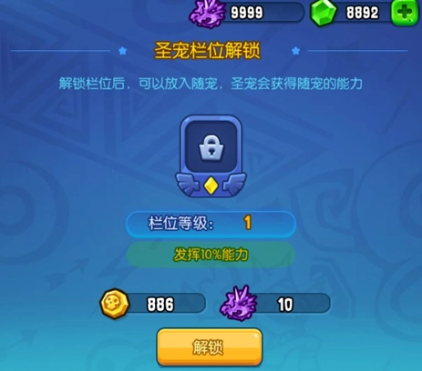 点击宠物栏后,可对其进行升级,随宠栏的最高等级为10级。解锁第一个栏位需要消耗金币,而后续的升级以及第二个栏位的解锁与升级,则需要使用新增的“龙币”(龙币是圣宠获得多余碎片时转化生成的)。
