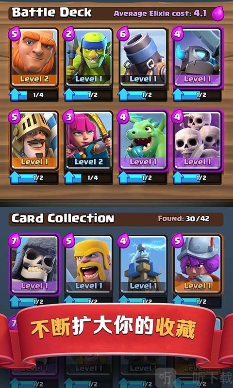 4. 收集皇室战争里的家族成员,以及部落冲突中熟悉的军队、法术、防御建筑等各类卡牌,用来构建并升级你的卡组。