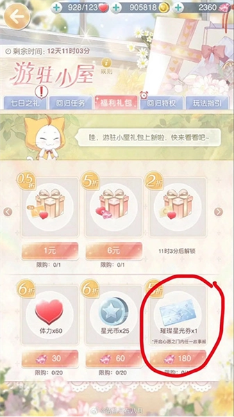 这里就涉及到璀璨星光券的获取途径(感觉有点像无限套娃);其中一个来源是老玩家回归礼包里会包含打折后的星光券