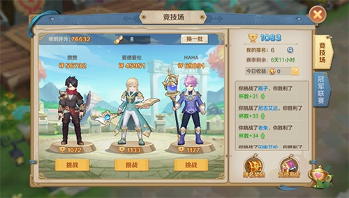 2、进入竞技场界面后,会有3名对手可供选择,要是不满意还能更换。或许大家都会留意自己与对手的评分对比,是不是评分比对手高就能选他并战胜他呢?NONONO!《云上城之歌》就是不走寻常路,要是这么简单就称不上有趣的PVP模式了!有时候你的评分高于对手,却未必能打赢;有时候评分低于对手,也不一定会输!
