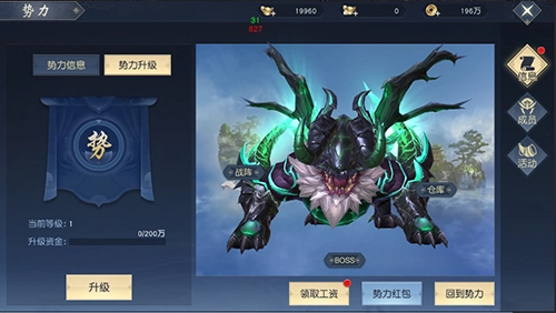 势力升级需要消耗材料和势力资金,势力资金由势力成员通过完成日常玩法积累。当势力资金达到升级要求时,即可进行升级操作;势力升级后,能够扩大成员规模,吸引更多志同道合的伙伴加入。