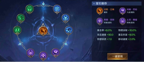 法修是一位以高频普攻为核心的持续输出射手,在星石搭配上,核心思路是强化输出能力,因此优先选择物攻、暴击类星石;为了弥补消耗能力的不足,橙色星石建议选用“灵狐·召唤”,紫色攻击星石则推荐“凤凰·焚焰”,以此来追求更稳定的高额持续输出。防御方面,通过“青藤·坚韧”来保障基础生存;通用类星石选择“土灵·赐福”,可以加快经济积累速度,助力前期发育和后期成型。