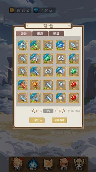 超过20名佣兵与30位精灵可协助勇者作战,更有超百件装备供你自由搭配,叠加攻击与防御属性。只要你愿意,就能打造出独属于你的特色军团!