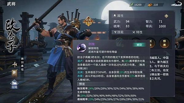 在游戏里,欧冶子的人物建模身后背着五把自己铸造的名剑,他的特性剑技也和这些剑紧密相关。解锁该特性后,欧冶子会佩戴三把亲手铸造的名剑——湛卢、龙渊与赤霄,每把剑都对应着独特的战斗属性:湛卢能提升欧冶子的武力伤害,龙渊可在他生命值偏低时触发生命夺取效果,赤霄则有概率让敌人在战斗中缴械。凭借这三把剑,欧冶子同时具备了输出、防护和战术三种能力,因此是后期相当值得培养的武将。