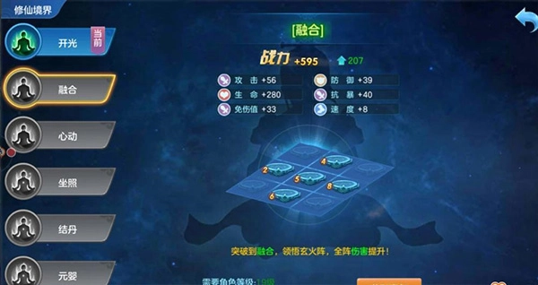 3:境界系统,初始阶段需达到特定境界,玩家才能让多个英雄同时上阵,并且境界能够为玩家提升战力。玩家可通过真气来升级,真气的获取途径也十分丰富,像门派比武、天命之塔、野外探索等场景都能获得!