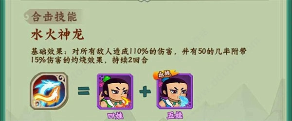 二娃具备出色的单体攻击能力,并且能够触发大娃的合击技能,适合安排在后排4号位进行补刀收割。