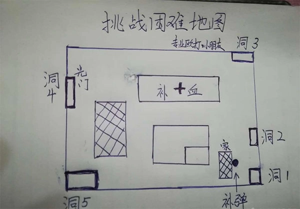 对于还不熟悉困难模式的玩家,建议先熟悉一下困难模式的平面图。入口3、4、5这三个位置都会刷新飞机怪,飞机怪对新手来说确实是个难题。所以我们的核心策略是守住1号和2号入口,同时安排火力较强的队友去防守3、4、5这三个入口。(附上平面图,画得比较简单,还请大家多多包涵)