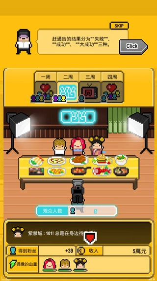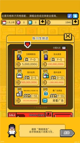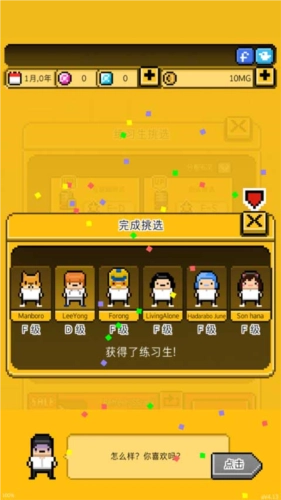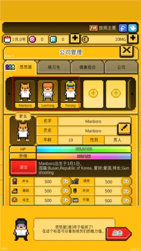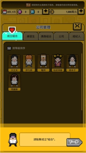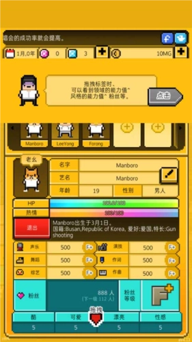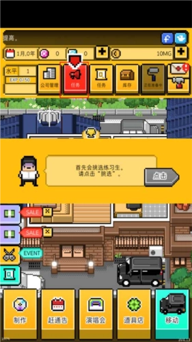 月刊偶像是一款像素风格的模拟经营游戏,围绕当下备受关注的偶像练习生主题展开。玩家在游戏中经营一家演艺公司,负责招募艺人、组建团体并助力他们成功出道。游戏玩法高度还原现实场景,玩家需要通过发行专辑、参与通告、举办演唱会等各类活动,逐步提升偶像团队的影响力,最终让旗下艺人走向国际舞台。