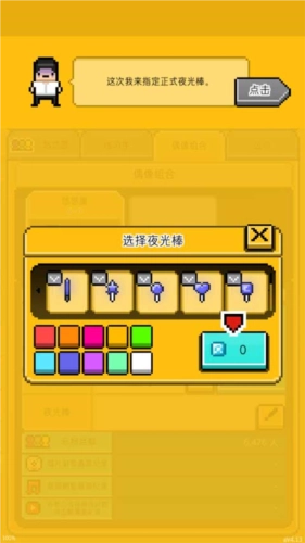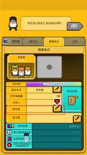 (5)偶像组合这一块,主要是着手创建粉丝团,这是获取收入的一个途径。点击下方的笔形图标可以用来设定粉丝团的名称,还能选择夜光棒之类的应援物品,只要把粉丝数量积累起来,就能获得更多的收益。