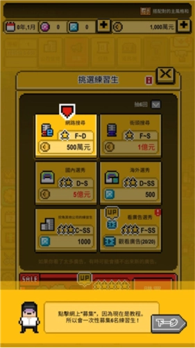 玩家创建好属于自己的公司后,就能挑选心仪的练习生打造偶像团体了,通过上方的任务按钮即可进入挑选界面。