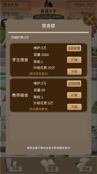宿舍的支出包含两个部分:一部分是升级投入,这能带来相当可观的学费收入;另一部分是维护费用,其金额受宿舍等级和容量的影响。而容量需要根据实际招生数量来规划建设,否则过高的维护成本会让你难以承受。