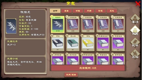 在成为书生后,院长会赠送三本书籍。这三本书籍可以在自宅的书房里将熟练度读满,因为论战是官员最重要的战斗手段。另外,获取任何物品后,都需要点击左上角的人物背包进行装备。
