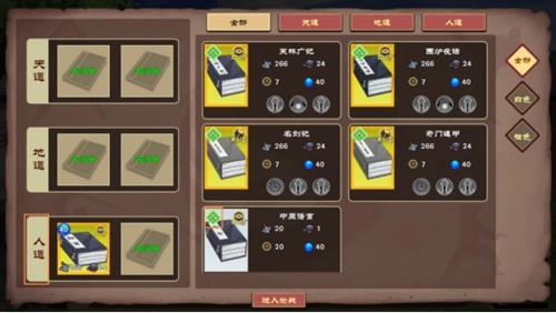 参与论战需配备1至6本书籍,需按书籍类型分别装配到天、地、人三道;攻击力的强弱由书籍品质决定,品质越优,造成的伤害越高。