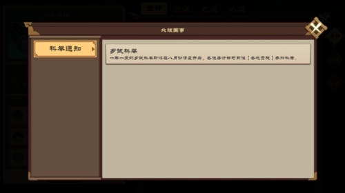 每年八月举行乡试,相关公告会提前三个月发布。这段时间里,我们可以攒钱提升自身属性、购置高级书籍,全力备战乡试!!!