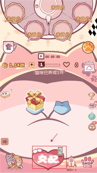 1、进入后,点击下方的“交配”按钮就能培育出新生的小猫咪。
