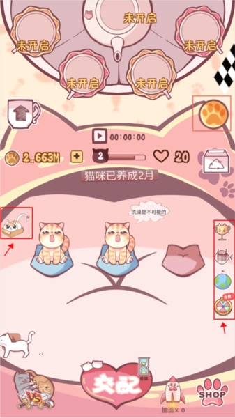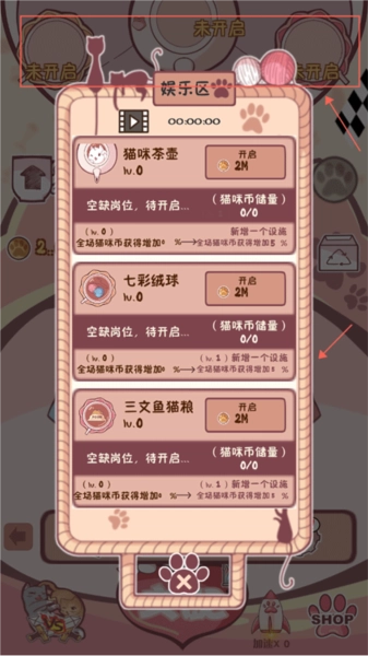 3、点击上方显示“未开启”的区域即可进入娱乐区,在这里你可以用金币解锁猫咪茶壶、猫粮等物品。