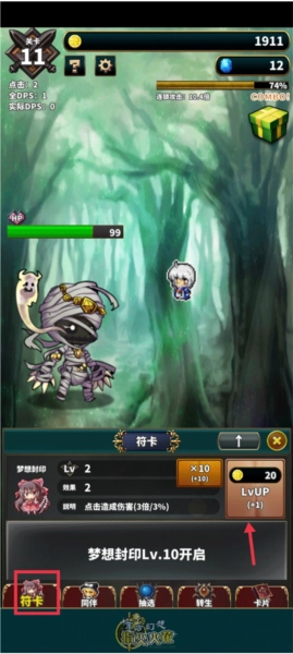 2、若想提升自身综合实力,可点击“符卡”功能,消耗一定数量的金币来提升等级,等级越高,造成的伤害值就越高。