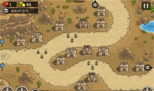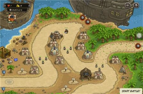 攻略:这一关开始英雄就能登场了,建议大家先把英雄练到满级再挑战,这样会更轻松。我用的是7级战士,也完全够用。英雄一开始放在上方路口,初始造塔时上方先建一个炸弹塔,中间和右边各放一个魔法塔,剩下的位置就造兵营和弓箭塔。右侧第一波敌人可以用增援守住,等有足够的钱就招募2个海盗堵住右边。优先把中上的炸弹塔升到顶级,接着把中间的弓箭塔升到顶级,再升级鹰眼来增加射程。之后再升级右上和右边的弓箭塔,还有魔法塔。前4波敌人都比较好对付,第5、6波压力会大一些,尤其是第6波有不少死灵召唤师,要记得及时升级各个塔楼,重点升级弓箭塔并配合连射技能,钱是比较充足的。这关英雄需要来回支援,左中右哪条防线吃紧就去哪边,注意步兵被火炮炸死后要及时用增援,特别是右侧的钻地怪,很容易漏掉。