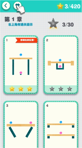 3、游戏以闯关玩法为核心,玩家在每个关卡中需按指定要求完成任务,系统会依据完成情况给予星级评定。随着关卡推进,难度将逐步提升,玩家通过持续挑战解锁更多精彩关卡,在切割绳子、营救可爱球球的过程中,获得超棒的游戏体验。
